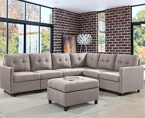 Ouchtek 7 Pieces Modular Sectional Sofas With Ottoman Grey Modern Furniture Linen Fabric Couches For Living Room