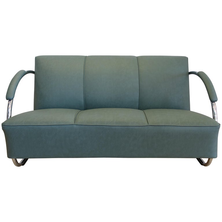 Streamline Chromed Steel And Green Synthetic Leather Sofa 1930s
